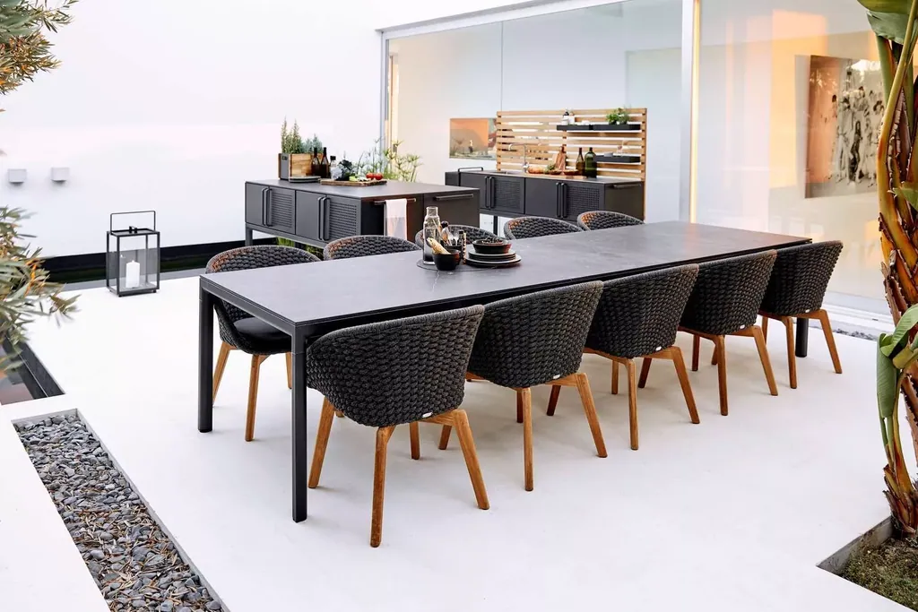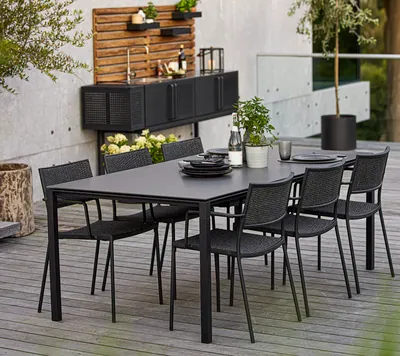 Essstühle für gesellige Mahlzeiten im Freien, begleitet von der Bequemlichkeit der Cane-line Designs.